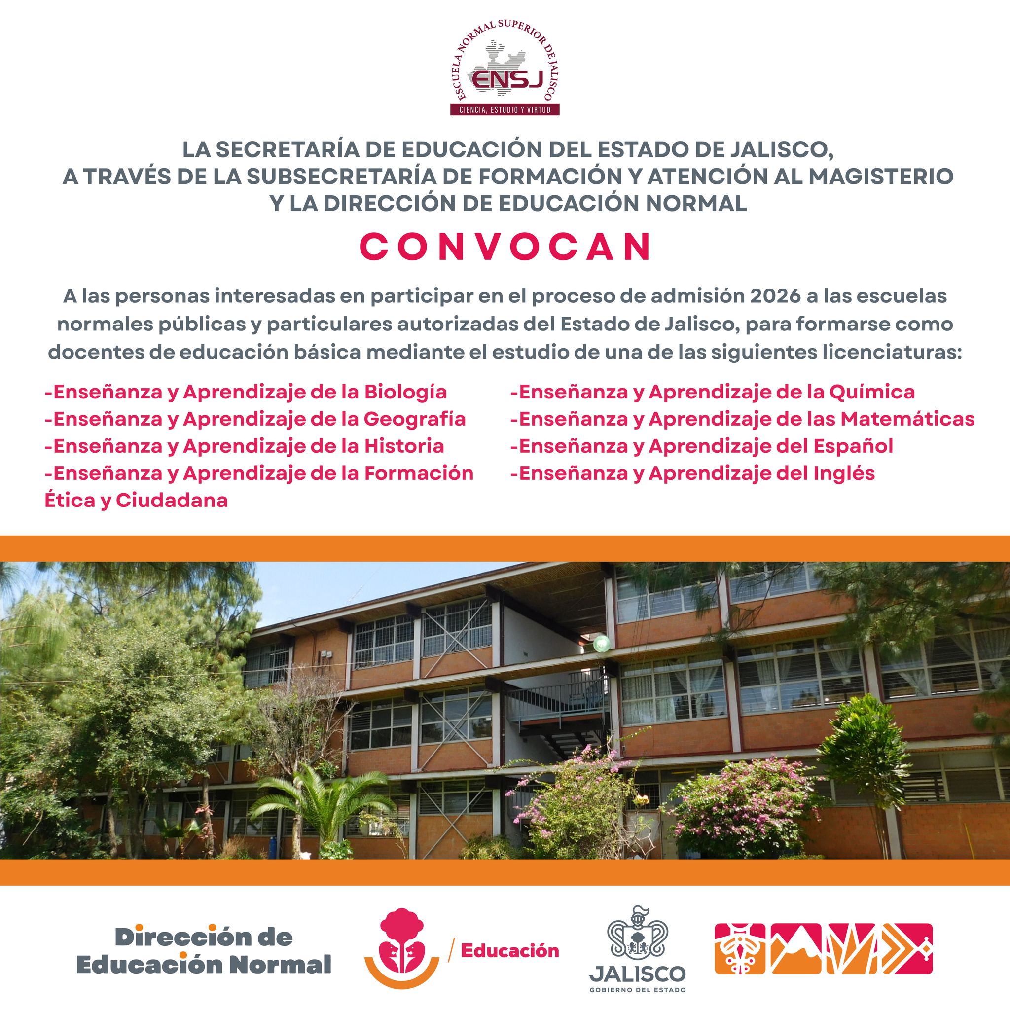 A las personas interesadas en participar en el proceso de admisión 2026 a las escuelas normales públicas y particulares autorizadas del Estado de Jalisco, para formarse como docentes de educación básica mediante el estudio de una de las siguientes licenciaturas: